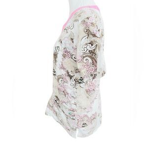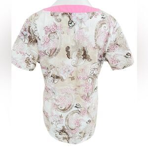 First one is v neck, cotton & polyester. Print is called Vintage Pink Paisley. 4 front pockets, side slits. Approximate measurements are pit to pit 20.5”, length from shoulder approximately 26”