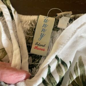 My daughter wore this years ago at a wedding in Hawaii. My then little girl daughter! Late 80’s. The green and white Sunny dress was never actually worn but we bought choices! The pink Paradise dress is a size 6, the Sunny green and white dress is a size 2. In kids. Have held on to them for years. We bought to fit at the time I’m not sure the sizing is accurate. The green dress is a 2 but looks bigger than the pink size 6?! I can add any measurements you might need. Clean home. No stains or holes. Long ties to tie to help with fit. 100 % rayon. Gorgeous colors! Really old, made in the USA.