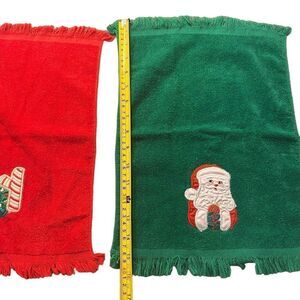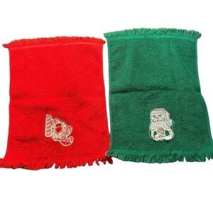 2 Vtg Christmas Embroidered Hand Towels JOY Candy CANE Green Santa Fringe Wreath