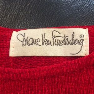 This is a Diane Von Furstenberg sweater. Long sleeves. Fuzzy material. Lightly stretchy. There is one spot on the left side where the material is a little dark (please see 2nd photograph). I am not sure if it is a stain or natural variation in the color of the sweater. I have not tried to wash it out. Other than that, there is no known flaws. Measures 26 inches across the bust and is about 36 inches in length. Price is firm. Thanks for looking.