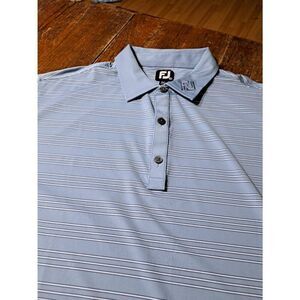 Good Used Condition Men's Size 2X FootJoy Blue and Purplish-Greyish Striped Three-Button Short Sleeve Pullover Golf Athletic Athleisure Loungewear Casual Wear Polo Shirt with Short Side Slits and Collar