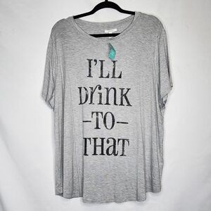 2X Grey I'll Drink To That Crew Neck Tee Jersey Knit Party St Patricks Day Bar Bachelorette short sleeve shirttail hem lightweight semi relaxed fit. NWT Maurices. Measurements for reference only approximately shoulder to hem 29" under arm to under arm 28" sleeve inseam 2" wt 8oz