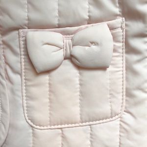 This jacket is in excellent condition, with a perfect light pink color, quilted design, and delicate bows on the pockets. Button closure. Lightweight material. Size 9-12 months but runs big enough to last the season