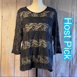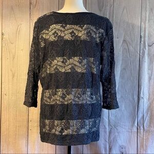 This top is in good condition with normal signs of wear. The shell is 52% cotton, 38% nylon and 10% rayon. The inner layer is 50% polyester, 43% rayon and 7% linen. It is machine washable. The inner layer is a striped lining and enhances the look of the top. It is 3/4 sleeve. Great looking top for a casual night out or a day at the office with dress pants.