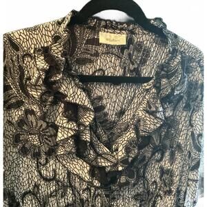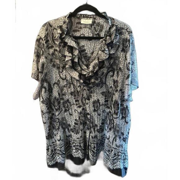 2X by Dressbarn. 27.5” across underarms x 30 3/4” shoulder to hem. Elevate your wardrobe with this chic ruffled neck floral button up top that features a stunning black and white floral pattern. Textured, short sleeves. Polyester with stretch. Its delicate ruffle detailing brings a touch of elegance to any outfit while the lightweight polyester fabric ensures comfort throughout the day. Preowned in good condition….itchy size tag gone. This top includes a soft inner tank cami. Perfect for casual outings, office wear, or special occasions, this stylish piece will quickly become a favorite in your collection.