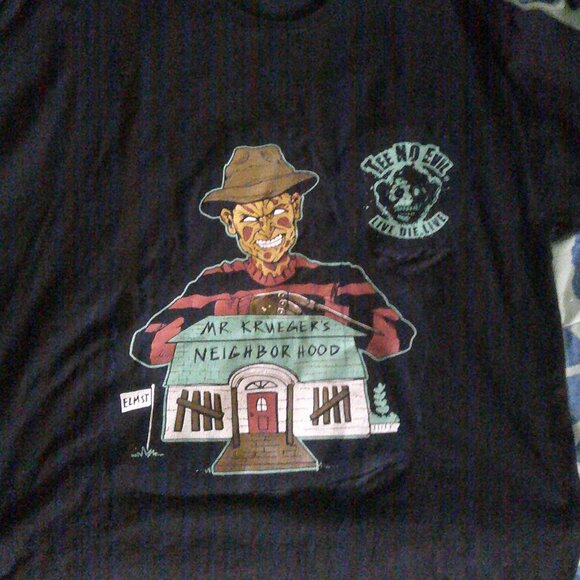My made by me custom 2L shirt is available to someone with rare style.I am guessing on the size as the tag has cut off.It is at least a 2XL.The front has Freddy Krueger,a house & makers label(clearly a parody of Mr. Rogers).The back is from the Eden anime on netflix.They are glued & sewed on.You should probably line dry this as dryer heat might loosen the glue.I am listing more fun t shirts.I offer a discount on multiple orders.Thanks for looking & try to have a great week.