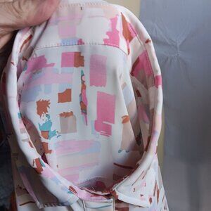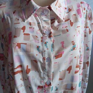 This vintage blouse showcases a colorful abstract print with long sleeves. The button-down front and pleated back design add a timeless touch to this stylish piece.
