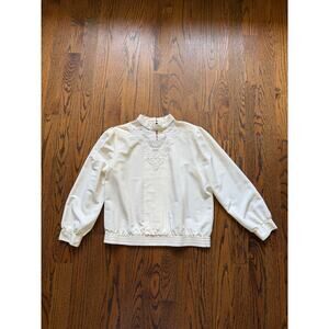 Vintage Blouse: Cream Poly Crepe Fabric, Laced Band Collar w/V-Neck Cut-Out, Gather Shoulder & Wrist, Fitted Cuff, Pearl Buttons Back & Wrist, Elastic Waist, Blouson Silhouette, Pleated Front, *Repaired Back Neck