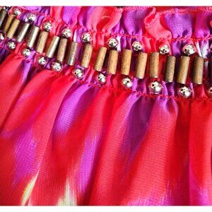 This unique maxi dress blends a strapless design with a striking bohemian-inspired print in shades of orange, purple, and yellow. The top features intricate wooden and metallic bead embellishments, adding a touch of handcrafted charm. With an elasticized waist for comfort and a flowing silhouette, this dress is ideal for warm-weather outings.