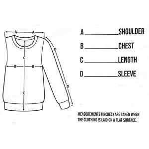 Measurements (inches) are taken when the clothing is laid on a flat surface.