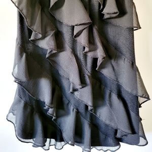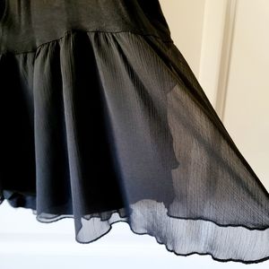 Excellent condition. Black, stretchy material with diagonal ruffles of sheer material. Approximately 26" from shoulder hem to bottom hem and 14" from armpit to armpit. From pet-free, smoke-free home.