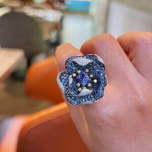 Details: 2ct cushion cut blue violet sapphire flower ring surrounded by yellow sapphire and paved with diamonds and blue sapphire in 18k white gold