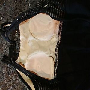 This one piece black suit with a flesh colored black mesh top offers pretty full fanny coverage while still being stylish. Cut to mid-back with a silver clasp at the back of the neck. Lightly worn, no fading.