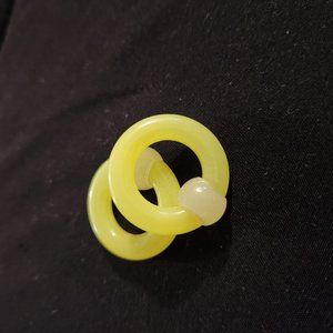 Set of five 2g earrings. (Not one hundred percent on gauge sizing. I bought these and never wore them and have forgotten if they are bigger or not.) All plastic except the rings connected. Those are metal. Unsure if yellow rings glow in dark. New and unused. Blue and red hoops have small filigree on end. Blueish hoops are wings.
