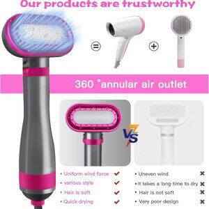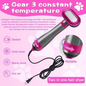 Brand new in original packaging. 2-in-1 pet-friendly hairdryer and brush. It's a game-changer for making bath time faster and easier. Not only does it dry your furry friend's coat efficiently with uniform air flow, but it also detangles and smoothens their fur simultaneously. With three heat settings, you can make sure your pet is comfortable and dries quickly without the stress of loud noises—it operates below 70 decibels, making it super pet-friendly. Plus, for your peace of mind, it has built-in overheating protection that automatically shuts off the dryer in case it gets too hot. Simplify your pet grooming routine with this handy tool!