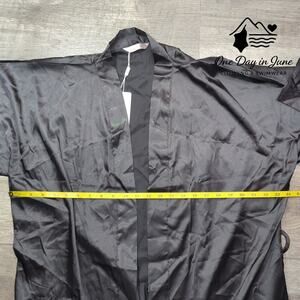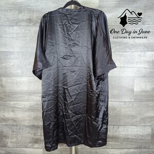 This silky black robe, oh so sleek and divine, will wrap you in comfort that's simply sublime! With luxurious feel and a sheen that's so bright, it's perfect for lounging from morning till night.