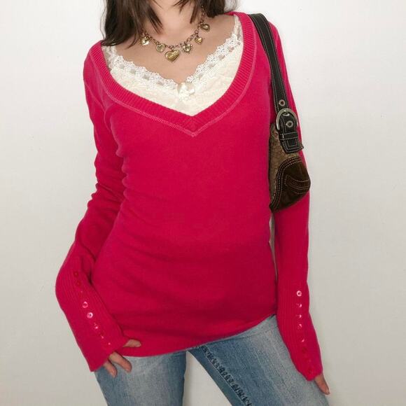 2k hot pink aéropostale vneck sweater with extra long sleeves with buttons on them! so soft and cozy! very bella swan vibes size large ptp- 24-30”