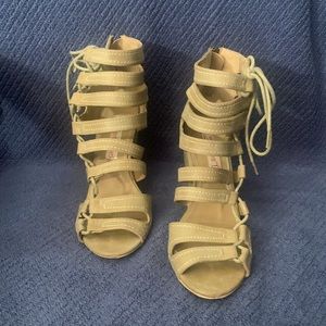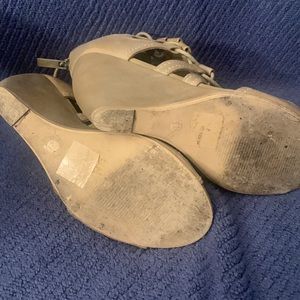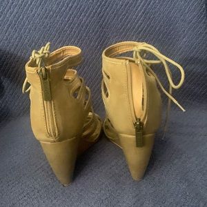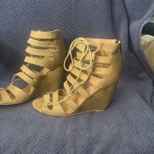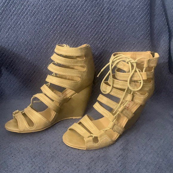 Beige strappy wedge heel sandals with laces. Zipper back easy on and off. Still in original box