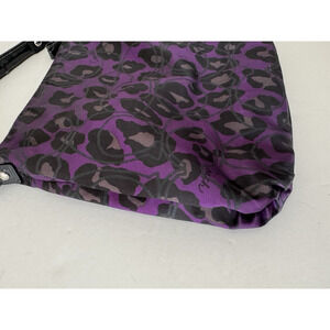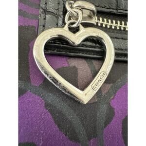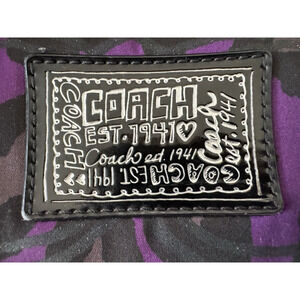 Coach Poppy & matching wallet. Very rare with a bold purple and black pattern. Features a secure zip closure and elegant design. Perfect for work or everyday use. Discounted due to condition; Call outs are: Rehabbed; No tags, cracking on handle, removed most ink marks. peeling on interior of wallet. As is condition. No returns, refunds or cancellations. See all photos.