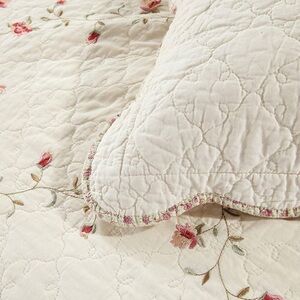Design: A sweet charming classic pillow shams that never goes out of style. Embroidered with wreaths of soft pink rose buds and sweet green leaves for a delicate design. The binding is made of a pink floral fabric that adds a touch of pattern. The scalloped edges give this pillow cover a feminine touch.