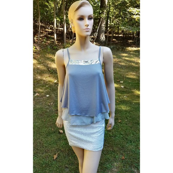 You will feel extra special in this elegant 2pc Strappy Chiffon Top & Skirt Set by Elisa B. Perfect for the stylish young woman this stylish chiffon overlay silhouette playfully pairs sparkly white & silver skirt with semi-sheer blouson top. The straight skirt sparkles, shimmers and shines through every party and special event with gorgeous two-tone sequined pattern, that is beautifully complemented with layered grey chiffon blouse top with sparkly silver sequin neckline. Perfect for clubbing. The skirt features zipper back closure. Outfit seems to be cut true to size, but the skirt is a mini length. 100% polyester, hand wash cold water.