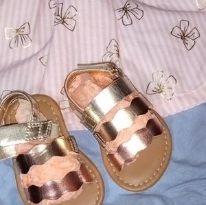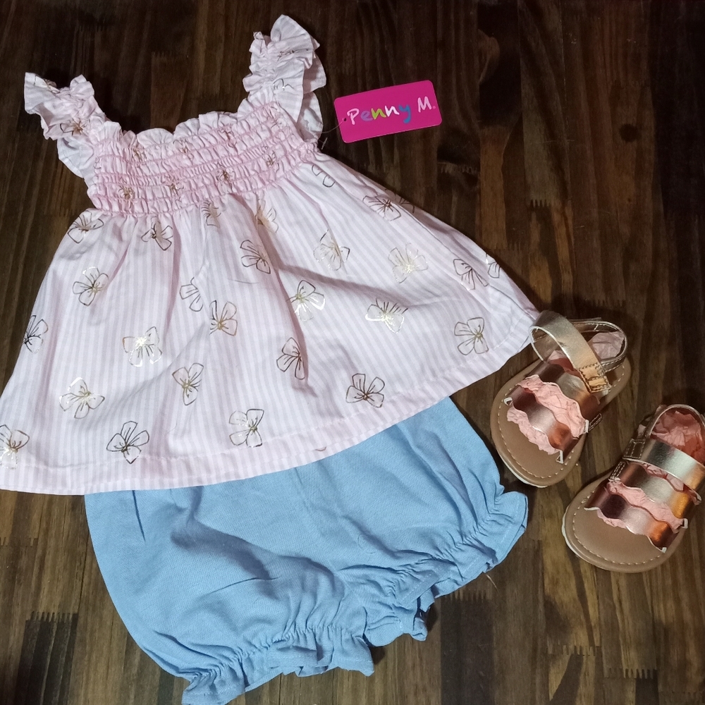 two piece top and bloomer set. Top has ruffle sleeves, metallic bows, elastic gathering around chest area. Bloomers denim color, elastic waist and legs (thigh).