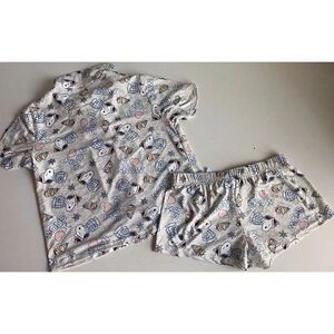 2pc Snoopy Woodstock Puffy Coat Puffer Jacket I Love Snow Soft Pajama Set Shorts Women’s Sz M Pastel Colors NEW