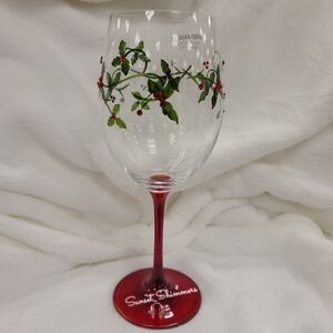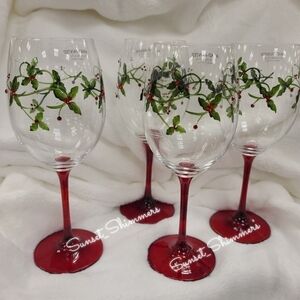 Add some sparkle to your holiday table with these beautiful wine glasses. Each clear glass is hand painted with holly Berries and embelished with sparkly Red rhinestones. Sooooo Pretty 😍 Capacity: 20 oz Gentle Hand Wash Only. Brand New!