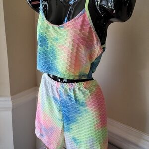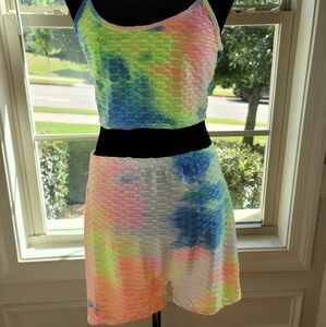 Chic Me 2pc multi color tye-dye bubble texture(tic-tok)shorts set, spaghetti straps top, elastic waist shorts, wide leg, polyester/cotton blend, summer fun perfect!!! NWT, never worn/used