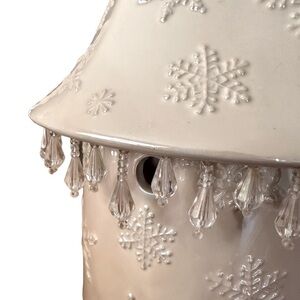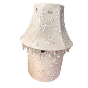 A beautiful quality, 2pc. snowflake candle holder with matching topper in a neutral ivory color. The candle holder fits a 3-wick candle (think Bath & Body Works 3-wick candle) and is patterned with snowflakes of various sizes. The candle topper is adorned with mini crystals at the base of the topper.