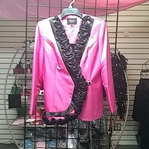 This fusha (hot pink suit) is accented with black ruffles.