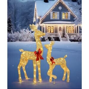 2pcs Large Golden Deer Set - Elegant /Indoor Christmas Decoration with Glowing Antlers & Twinkling Lights-like Effect, Sturdy Plastic Garden Deer Mother & Fawn (73”Tall x 27”Wide x 136”Spreading) - All-Weather Durable Winter Yard Decor for Holiday & Year-Round Use - Easy Assembly Required - Ideal Gift for Home or Garden - Festive Deer Pair with Warm Glow Lighting Design, Christmas Reindeer, Christmas Decorations for Yard