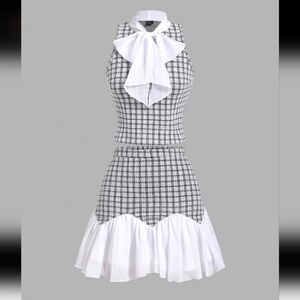 2pcs Set Women Bow Plaid Vest & Asymmetrical Ruffle Trim Skirt