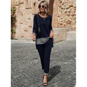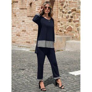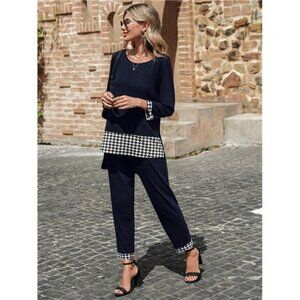 2pcs Women Casual Elegant Houndstooth Patchwork Loose Top And Pants Set, Autumn