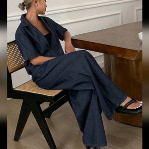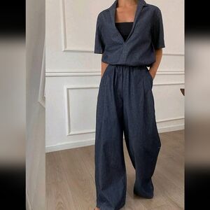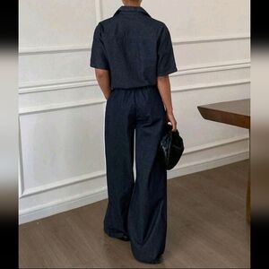 2pcs/Set Women Deep V-Neck Short Sleeve Denim Top And Elastic Pants
