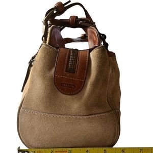 Super cute Authentic Coach Bag in Suede. Comes with a pouchette wristlet bag. There is some slight denim color transfer on one side of bag but it’s minimal.