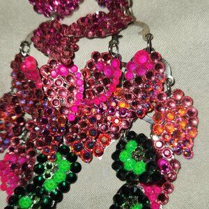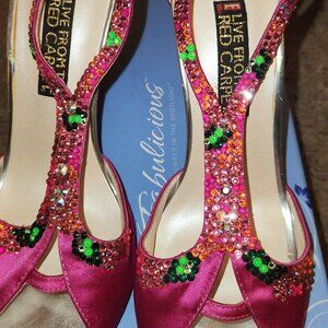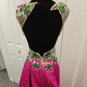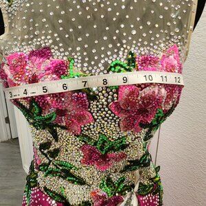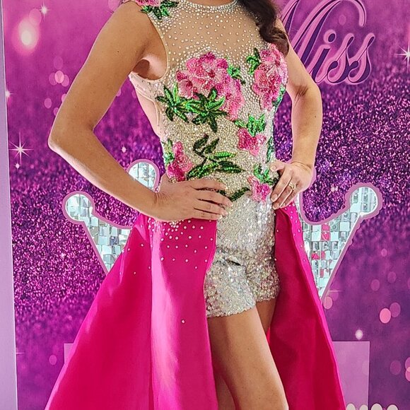 2-piece fun fashion for pageant. Worn 2 times for state/international competition. My measurements are 34-26-34, this 2-piece, top measurement 15 in across and has open back and lower back zipper, shorts are tag size 6. Includes earrings (pierced) and shoes marked size 8.5B some (I never wore, too big for me, in good shape. I purchased this used, it was a gown that was converted to a fun fashion. I am the second owner; super cute outfit needs a new home.