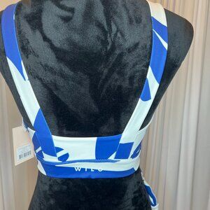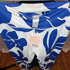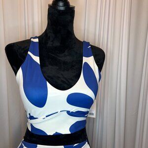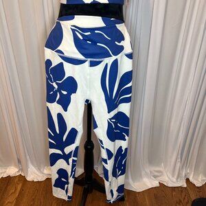 Two-piece athletic set features a bold, abstract, floral, print in cobalt blue and white. The floral design is large and resembles a leaf pattern. The sports bra has a racerback with a scoop neck and a band under the bust; removable bra pads. The leggings are high-waisted with a wide waistband. Performance fabric, 73% Polyester and 27% Spandex. Size Large but runs very small.