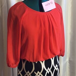 Sweet little dress with a semi sheer top that is lined, sheer 3/4 length sleeves, patterned stretch skirt
