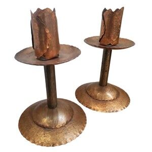 Each candlestick measures 7 inches in height and is perfect for holding your favorite scented candle. The hammered brass finish gives these candle holders a unique and artistic look. Ideal for collectors or anyone looking to add some charm to their home.