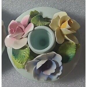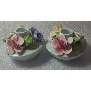 This product is a set of 2 vintage Thorley Staffordshire England bone china porcelain floral candle holders. Featuring a beautiful floral pattern with roses, these multicolor candle holders are intricately designed in the Capodimonte style. Made in the United Kingdom, these original pieces are perfect for any room and all occasions. With a touch of elegance and charm, these candle holders will add a touch of vintage sophistication to any space.