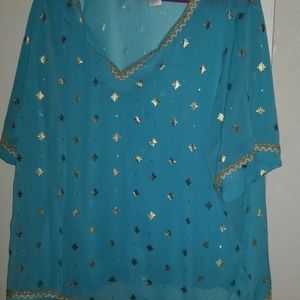 Short sleeve. Gold and white embroidered trim. V cut opening in front. Has two side pockets. 100 polyester. Never worn