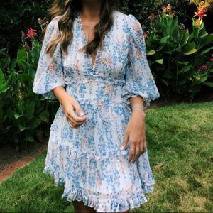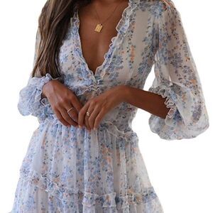 ✨super cute dress featuring ruffle-cuffed lantern sleeves, a delicate ruffle trim around the skirt, torso and neckline and our favorite part: the most adorable cutout back feature trimmed with the same pretty ruffle detail echoed throughout the dress.The sheer chiffon is soft and floaty and there's a lining under the skirt and bust for modesty.