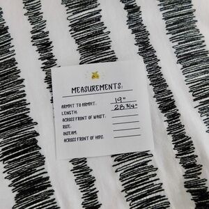 Rounded crew neckline Sleeveless … arm openings have a rolled edge ~ Straight hemline with one slit one the bottom/side (on one side only) ~ Longer tunic length ~ Pullover styling … no closures ~ White with a black embroidered “Scribbles” print on the front … back is a solid white