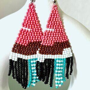 Introducing our stunning hand beaded contemporary color block earrings. These earrings feature a unique and contemporary color block design. The unique and eye-catching color combination features five colors including a gorgeous warm pink, brown, white, black, and turquoise. Exquisitely handcrafted.