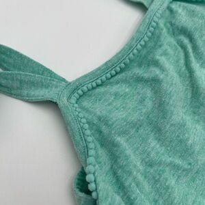 Sleeveless romper. Solid Teal, 57% Cotton, 38% Polyester, 5% Spandex elastic waist with tie for decorative flair, breaded design around the neck