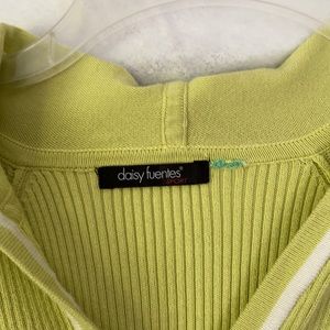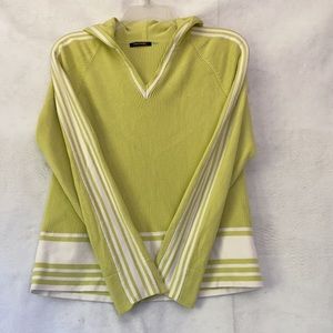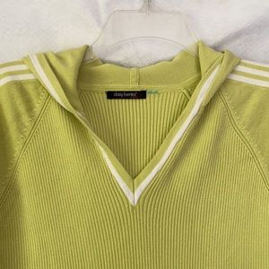 Daisy Fuentes Sport muted (As opposed to bright neon) lime green, white stripes knit sweater hoodie with V Neck no drawstring style. Long sleeves. Approximate flat lay measurements: Pit to pit 18” plus 3-4 inch stretch. Length from center back base of collar to hem 22”. Sleeve 27.5” minor repair done at neckline near label, see photos. Casual sweatshirt knit hoodie pullover Chilly spring days & cool summer evenings. Beach lake outdoor camping sporty attire yoga street wear walking bike riding apparel.
