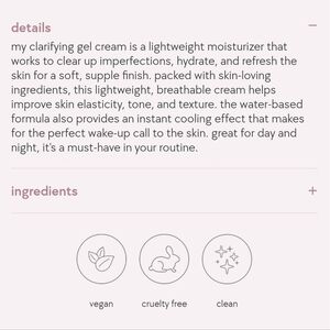 Clarifying gel cream is a lightweight moisturizer that works to clear up imperfections, hydrate, and refresh the skin for a soft, supple finish. packed with skin-loving ingredients, this lightweight, breathable cream helps improve skin elasticity, tone, and texture. the water-based formula also provides an instant cooling effect that makes for the perfect wake-up call to the skin.