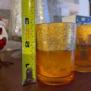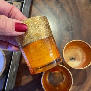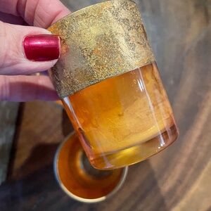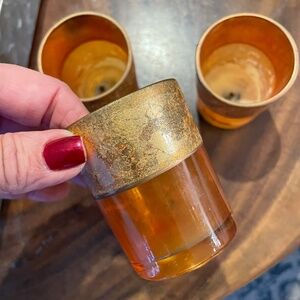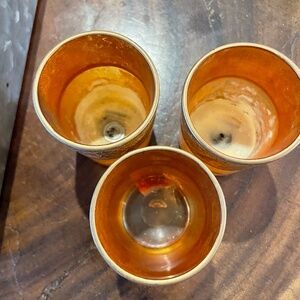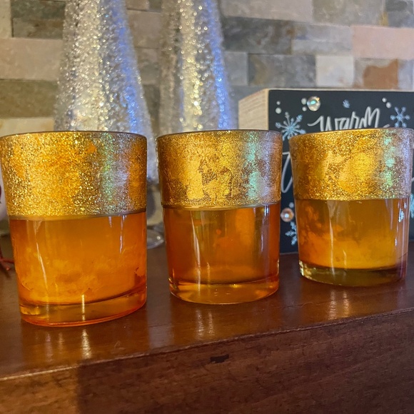 3 Amber & Gold colored Tea Light Holders. Sold together. So pretty with a tea light glowing inside. Sold as they are...still some wax in bottom of a couple, (easily melted out) But really pretty accents to a holiday decor or just any decor that needs a gilded touch! They are an amber colored glass with gold leaf edging. I will ship ASAP for holidays. Check out my other items for a bundle discount!