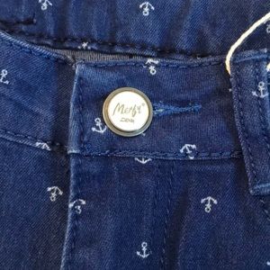 Blue skinny jeans by the Thai brand Merfy . Trendy jeans with white anchor pattern printed throughout. Cute for a fun night out at the resort or beach...pair with flats or heels for a great look.